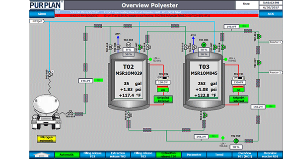 The handling of chemical substances requires the highest degree of trust and quality. PURPLAN automation engineering is specially focused on our customer processes. We develop custom-made concepts form main control panels including remote I/O / HMI /emergency stop, software to the qualified commissioning. PURPLAN automation engineering can address the entire range of process automation in fluid and solid applications including hazardous location applications. This includes user friendly Human Machine Interface (HMI), central process management system for the control of complex mixing – and blending systems together with a worldwide remote monitoring and control service and distinct safety standards.
